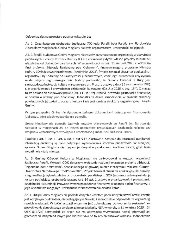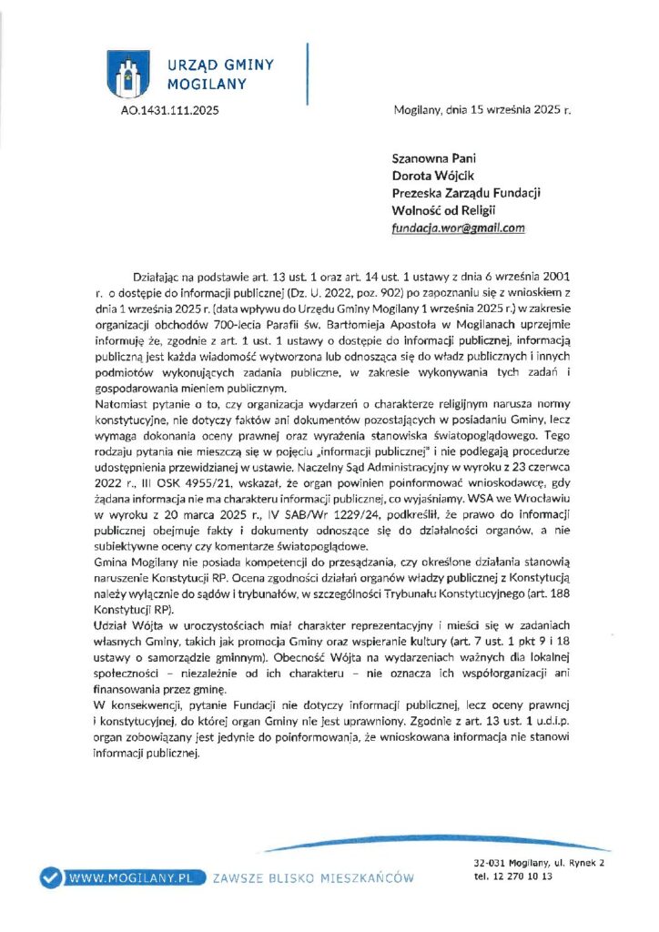 Działając imieniem Fundacji Wolność od Religii z siedzibą w Lublinie, na prośbę mieszkańców, którzy przekazali nam informacje o sposobie organizowania jubileuszu 700-lecia Parafii w Mogilanach zaplanowanego na 31.08.2025 r. – 01.09.2025 r. wnioskujemy o udzielenie odpowiedzi na pytanie czy organizacja przez gminę wydarzeń o charakterze stricte religijnym nie narusza normy Konstytucji RP Art. 25 ust. 2. Władze publiczne w Rzeczypospolitej Polskiej zachowują bezstronność w sprawach przekonań religijnych, światopoglądowych i filozoficznych, zapewniając swobodę ich wyrażania w życiu publicznym? Czy Wójt nie uważa jej za dyskryminującą i wykluczającą wobec mieszkańców należących do mniejszości światopoglądowych?