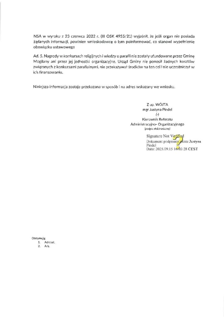 W dniu 15 września 2025 r. wpłynęła odpowiedź z Urzędu Gminy. Pierwsza strona poświęcona została udowadnianiu fundacji, że nasze pytanie o świeckość urzędu nie jest pytaniem zadanym w trybie UDIP. Ależ oczywiście, że nie jest. Pytania w trybie UDIP zadaliśmy w punktach, w innym miejscu naszego pisma. W dalszej części gmina informuje, że nie poniosła żadnych kosztów finansowych organizacji wydarzenia religijnego, a wójt był tam obecny na zaproszenie parafii.