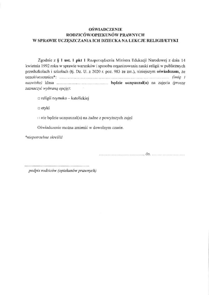 2. Życzenie, o którym mowa w ust. 1, jest wyrażane w formie pisemnego oświadczenia. Oświadczenie nie musi być ponawiane w kolejnym roku szkolnym, może jednak zostać zmienione.