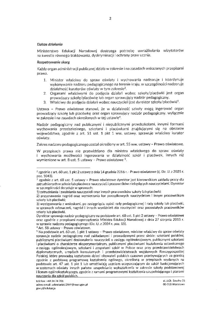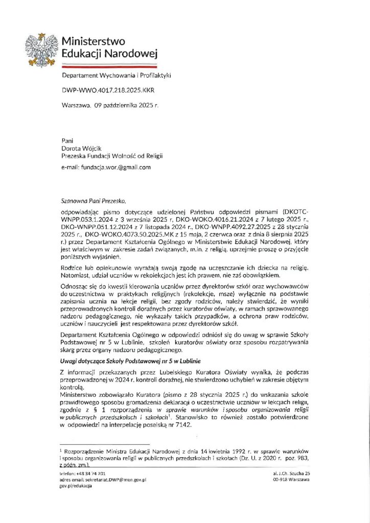 W dniu 13 października 2025 r. wpłynęła odpowiedź na pismo fundacji. Ministerstwo informuje „odnosząc się do kwestii kierowania uczniów przez dyrektorów szkół oraz wychowawców do uczestnictwa w praktykach religijnych (rekolekcje, msze) wyłącznie na podstawie zapisania ucznia na lekcje religii, bez zgody rodziców, należy stwierdzić, że wyniki przeprowadzonych kontroli doraźnych przez kuratorów oświaty, w ramach sprawowanego nadzoru pedagogicznego, nie wykazał takich przypadków, a ochrona praw rodziców, uczniów i nauczycieli jest respektowana przez dyrektorów szkół (…). Odnosząc się do pozostającego we właściwości Departamentu Kształcenia Ogólnego (DKO) zarzutu dotyczącego kierowania uczniów do udziału w praktykach religijnych (rekolekcje, msze) przez dyrektorów szkół uznano, że sformułowanie to nie znajduje potwierdzenia w faktach. Do DKO nie wpłynął żaden wniosek, skarga czy sygnał w tej sprawie.”