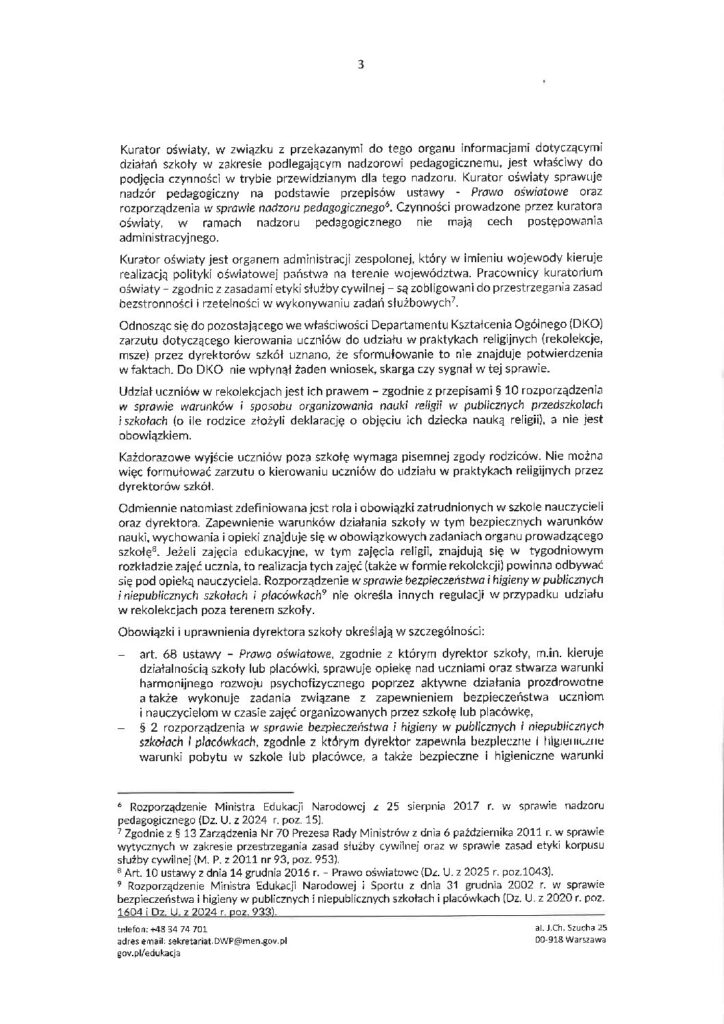 „Odmiennie natomiast zdefiniowana jest rola i obowiązki zatrudnionych w szkole nauczycieli oraz dyrektora. Zapewnienie warunków działania szkoły w tym bezpiecznych warunków nauki, wychowania i opieki znajduje się w obowiązkowych zadaniach organu prowadzącego szkołę. Jeżeli zajęcia edukacyjne, w tym zajęcia religii, znajdują się w tygodniowym rozkładzie zajęć ucznia, to realizacja tych zajęć (także w formie rekolekcji) powinna odbywać się pod opieką nauczyciela. Rozporządzenie w sprawie bezpieczeństwa i higieny w publicznych i niepublicznych szkołach i placówkach nie określa innych regulacji w przypadku udziału w rekolekcjach poza terenem szkoły (…) par. 14 ww. rozporządzenia zobowiązuje do nadzoru nauczyciela podczas przerw w zajęciach (taką przerwą w zajęciach jest także wyjście ze szkoły na rekolekcje).