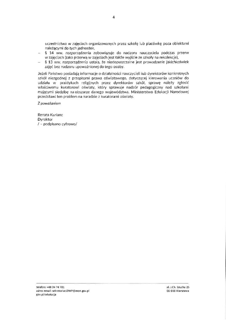 W końcowym zaś fragmencie ww. pisma, na które niniejszym odpowiadamy, piszecie Państwo, że w przypadkach nadużyć „sprawę należy zgłosić właściwemu kuratorowi oświaty”. Zapewniamy, że naruszenia zgłaszamy do kuratoriów, przy czym powracającym problemem jest brak reakcji czy nawet akceptacja naruszeń przez kuratoria oraz deklarowany brak znajomości przypadków naruszeń ze strony DKO MEN mimo tego, iż fundacja takie przypadki skrupulatnie odnotowuje, a także informuje o nich MEN m.in. w skargach na bezczynność kuratoriów. Cieszymy się, że jednocześnie zapowiadacie Państwo poruszenie tematyki niniejszej korespondencji na naradzie z kuratoriami oświaty. Jednocześnie musimy stwierdzić, że obawiamy się, iż MEN pozostanie dalej bez wiedzy o przypadkach naruszeń w szkołach. Prosimy o objęcie kwestii naruszeń wolności sumienia i praw człowieka osób bezwyznaniowych i mniejszości wyznaniowych, a także działań bądź braku działań kuratorów oświaty w tym obszarze monitoringiem MEN.