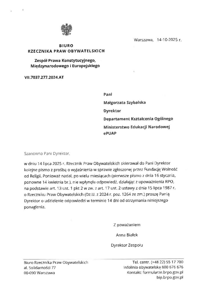 Dnia 16 stycznia 2025 r. Rzecznik przesłał do wiadomości fundacji pismo wysłane do Pani Małgorzaty Szybalskiej, Dyrektor Departamentu Kształcenia Ogólnego MEN, z prośbą o udostępnienie odpowiedzi, której ministerstwo udzieliło na nasze pismo z 18 listopada 2024 r. (nie udzieliło, stąd wezwanie przedsądowe wysłane 15.01.2025 r.).