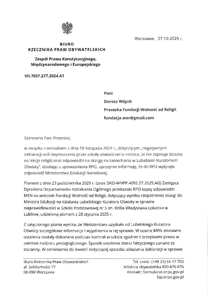 W dniu 14.10.2025 r. i 27.10.2025 r. wpłynęły do fundacji pisma od Rzecznika Praw Obywatelskich, który również monitorował sprawę na prośbę fundacji.