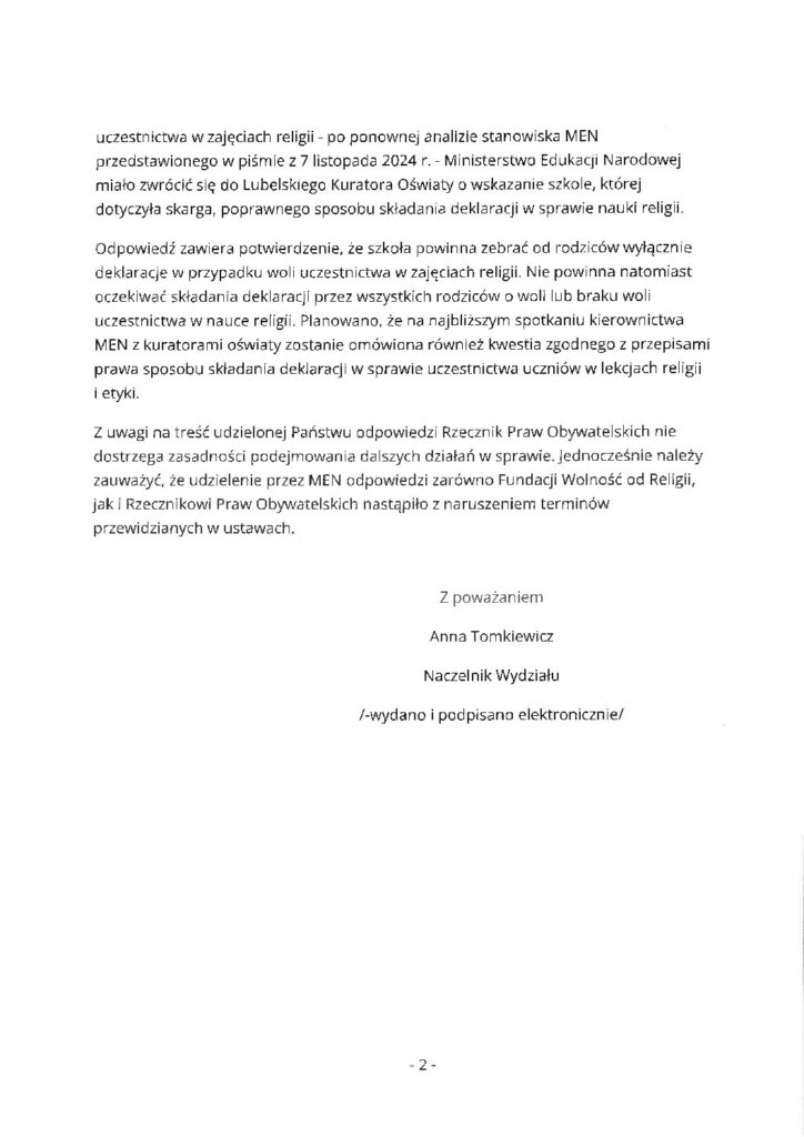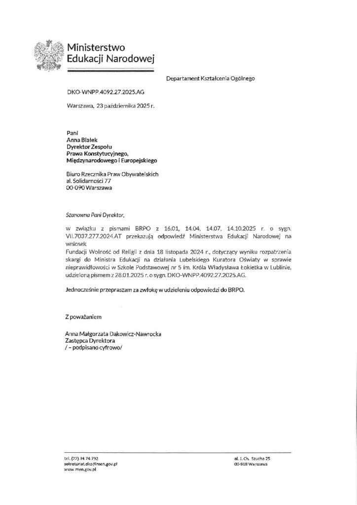 W dniu 7 listopada 2024 r. wpłynęła odpowiedź podpisana przez Panią Annę Małgorzatę Dakowicz-Nawrocką, Zastępcę Dyrektora w Departamencie Kształcenia Ogólnego, która uznaje działania szkoły za zasadne i zgodne z Konstytucją RP w tym również wymuszanie od rodziców składania oświadczeń negatywnych w sprawie udziału w zajęciach religii rzymskokatolickiej.