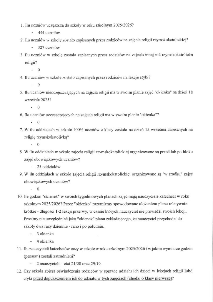 - Ilu nauczycieli katechetów uczy w szkole w roku szkolnym 2025/2026 i w jakim wymiarze godzin (pensum) zostali zatrudnieni?