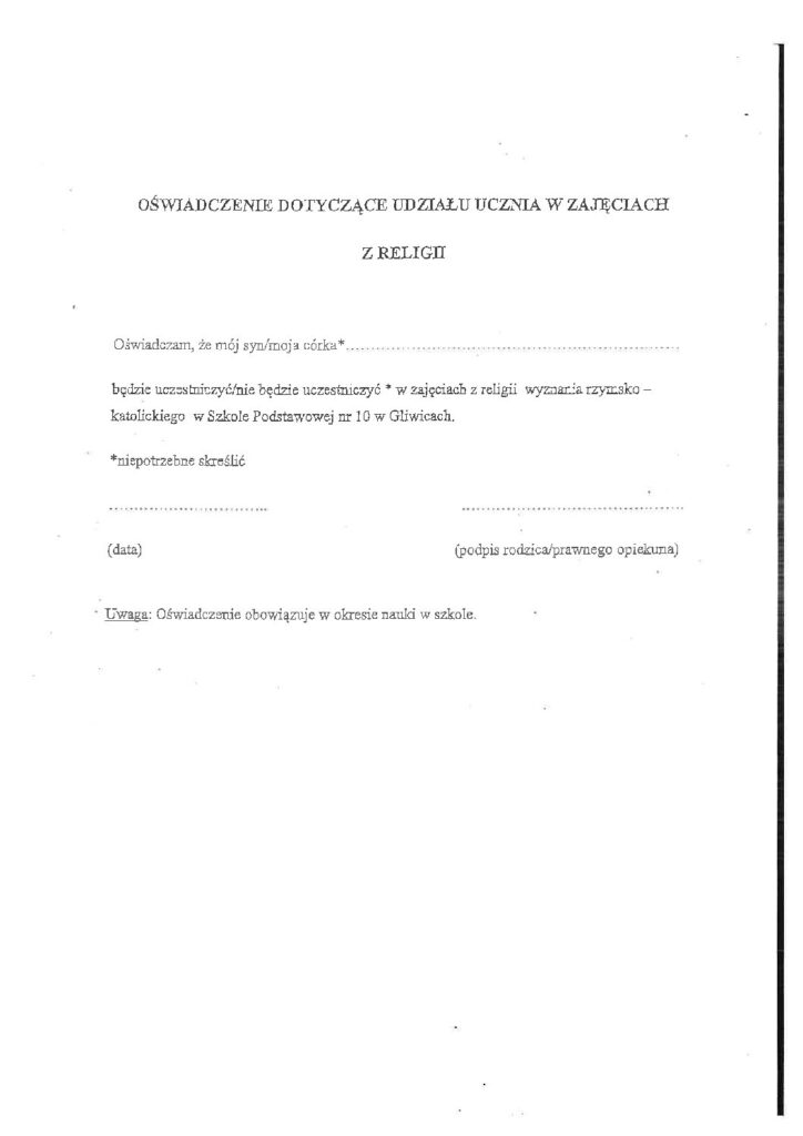 Dyrekcja szkoły w odpowiedzi na naszą prośbę załączyła druk oświadczenia dotyczącego udziału ucznia w zajęciach religii rzymsko-katolickiej, w którym zauważamy nieprawidłowości m.in. wymuszanie oświadczeń negatywnych w sprawie udziału w lekcjach z religii (syn/córka nie będzie uczestniczyć), pominięcie w drukach przedmiotu etyka, a także preferowanie wyboru religii wyłącznie jednego wyznania.